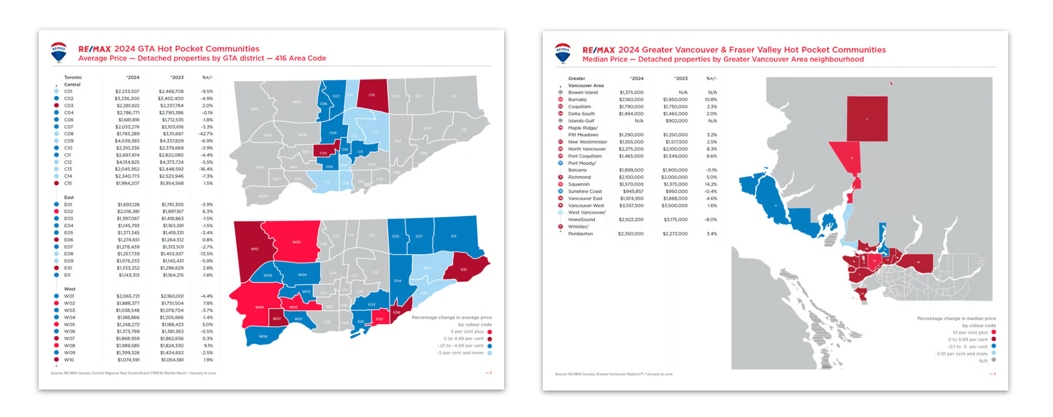 The 2024 Hot Pocket Communities Report explores detached home trends in the Greater Toronto, Greater Vancouver and Fraser Valley markets. This report explores how experienced buyers & investors are creating a bump in key detached housing markets resulting in detached home values to climb in over 80% of Fraser Valley communities; 70% of Greater Vancouver; and 40% of the GTA’s 905 areas.