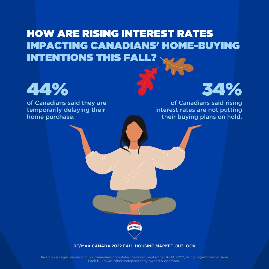 - Rising interest rates have prompted 44 per cent of Canadians to temporarily shelf their home-buying aspirations, while 34 per cent say they won’t hold on purchasing a home for the foreseeable future