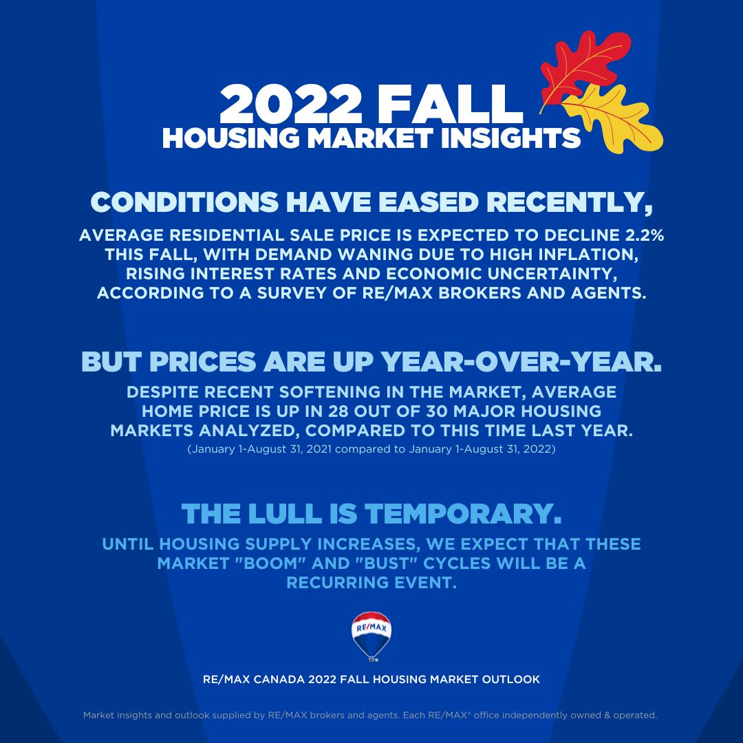 - RE/MAX brokers and agents anticipate prices in the Canadian housing market to ease by 2.2 per cent this fall, due to high inflation, rising interest rates and economic uncertainty