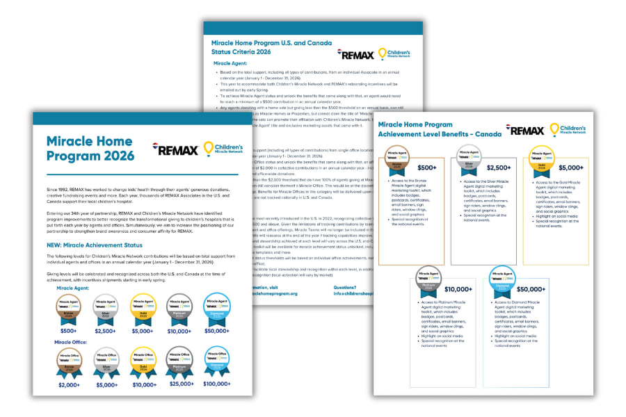 Get recognized for being a part of the CMN Miracle Home Program. There have been program improvements to better recognize the transformational giving to children’s hospitals that is put forth each year by REMAX agents and offices.