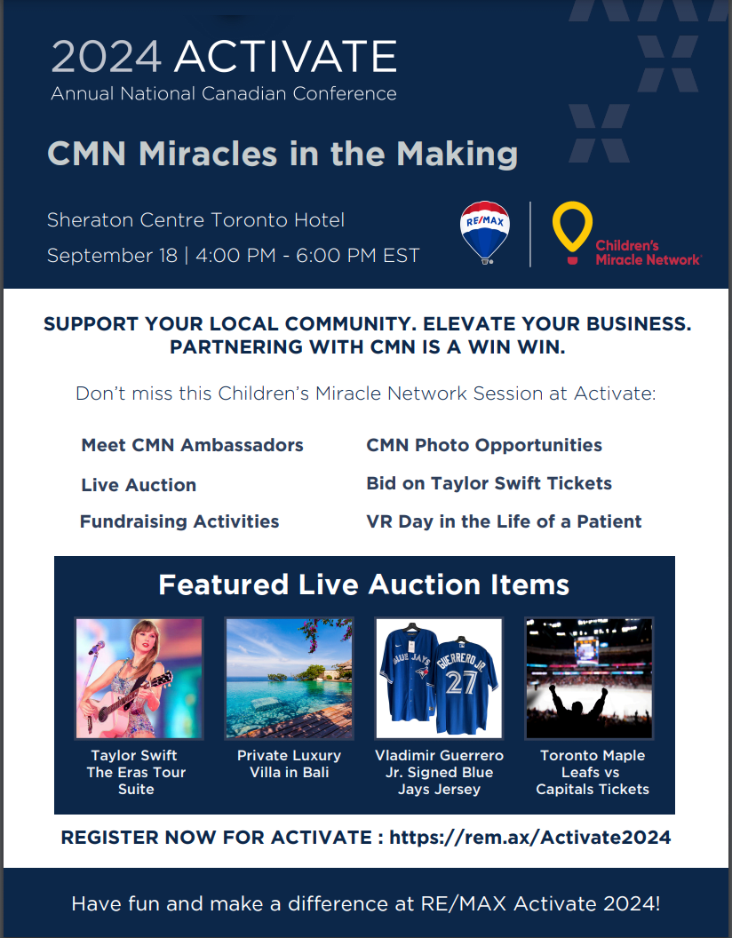 Attending the 2024 RE/MAX Activate Conference? Join us September 18th for the CMN Miracles in the Making session from 4pm-6pm. We’ll be celebrating our partnership with the Children’s Miracle Network and the outstanding contributions made by RE/MAX affiliates to their local CMN children’s hospital foundations.