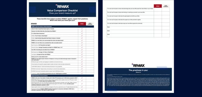Use this checklist to share with your current agents to remind them of the value REMAX provides. Share this with prospects so they can compare what their current brand offers compared to REMAX.