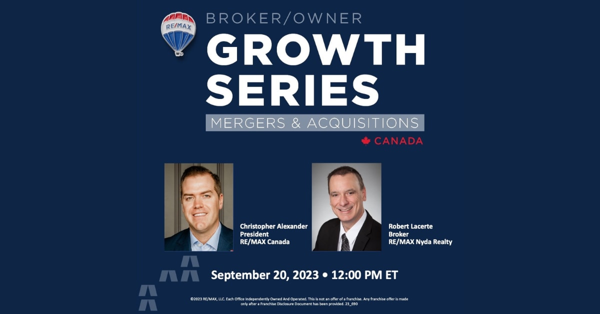 Be motivated to reach your goals for growth. Get expert mergers and acquisition tips to help you reach them faster. Register now and tune in to watch RE/MAX broker/owner Robert Lacerte share invaluable information with Christopher Alexander, President of RE/MAX Canada.