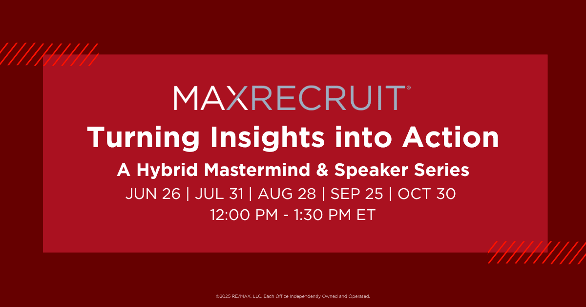 Join other RE/MAX agents, broker/owners and teams for the Turning Insights into Action Series—a hybrid mastermind where we share, learn, and grow as a community. Each session kicks off with a guest speaker diving into real-world strategies on things like lead generation, social media, tech tools, and how to stay ahead in today’s ever-changing market.