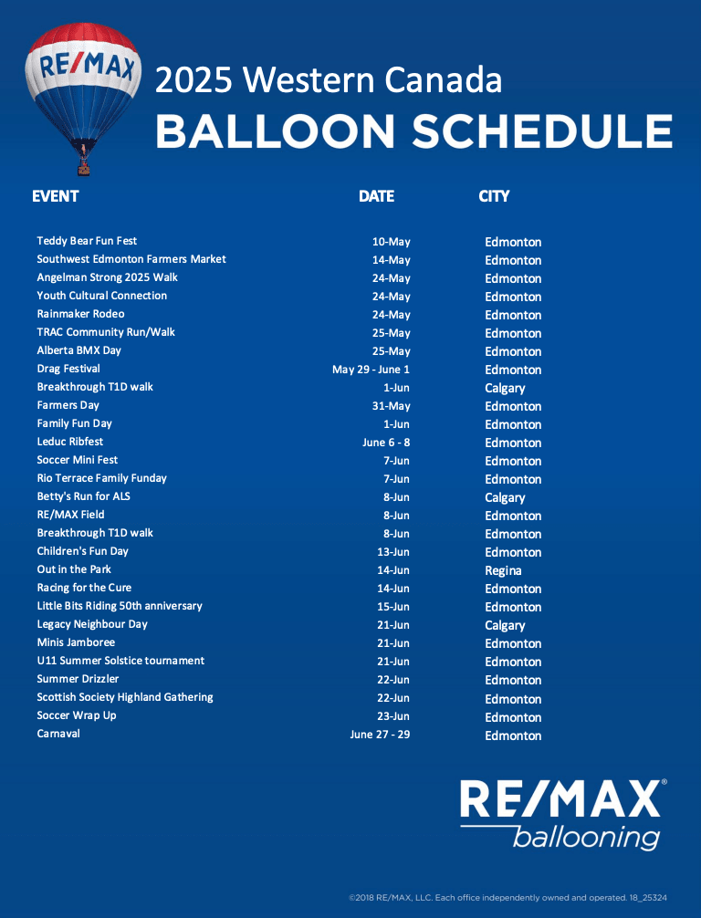 Each year, the Hot Air Balloon takes to the Canadian skies to spread some red, white and blue cheer at community events or to capture the attention of buyers and sellers. Click below to download the eastern and western 2025 Hot Air Balloon Schedules.
