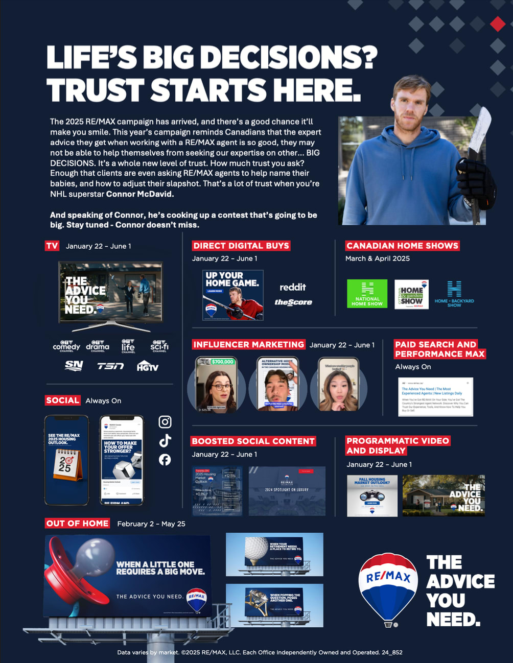 The biggest name in real estate has teamed up with the biggest name in hockey, NHL superstar Connor McDavid, in RE/MAX’s latest iteration of the “Advice You Need” consumer ad campaign. This year’s campaign will reinforce with Canadians why REMAX agents are the only option when looking for expert advice for ONE of life’s biggest decisions.