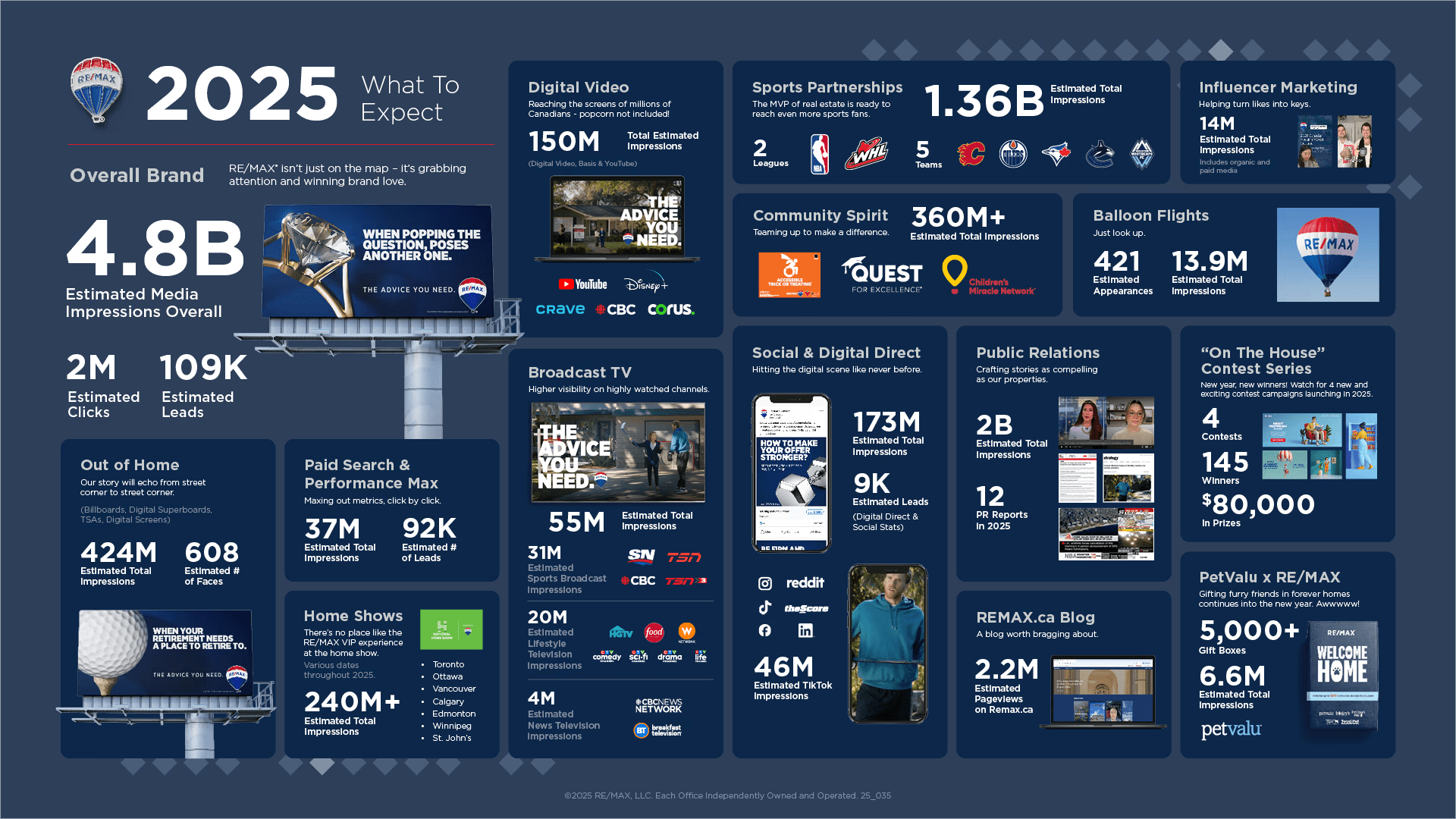 Real estate continues to be a hot topic in Canada, and REMAX is here to inform and advise buyers and sellers.. In 2023, REMAX Canada garnered 2.14 billion PR impressions, were named in 13,000+ news stories and released 11 market reports, making REMAX the voice of real estate in Canada.