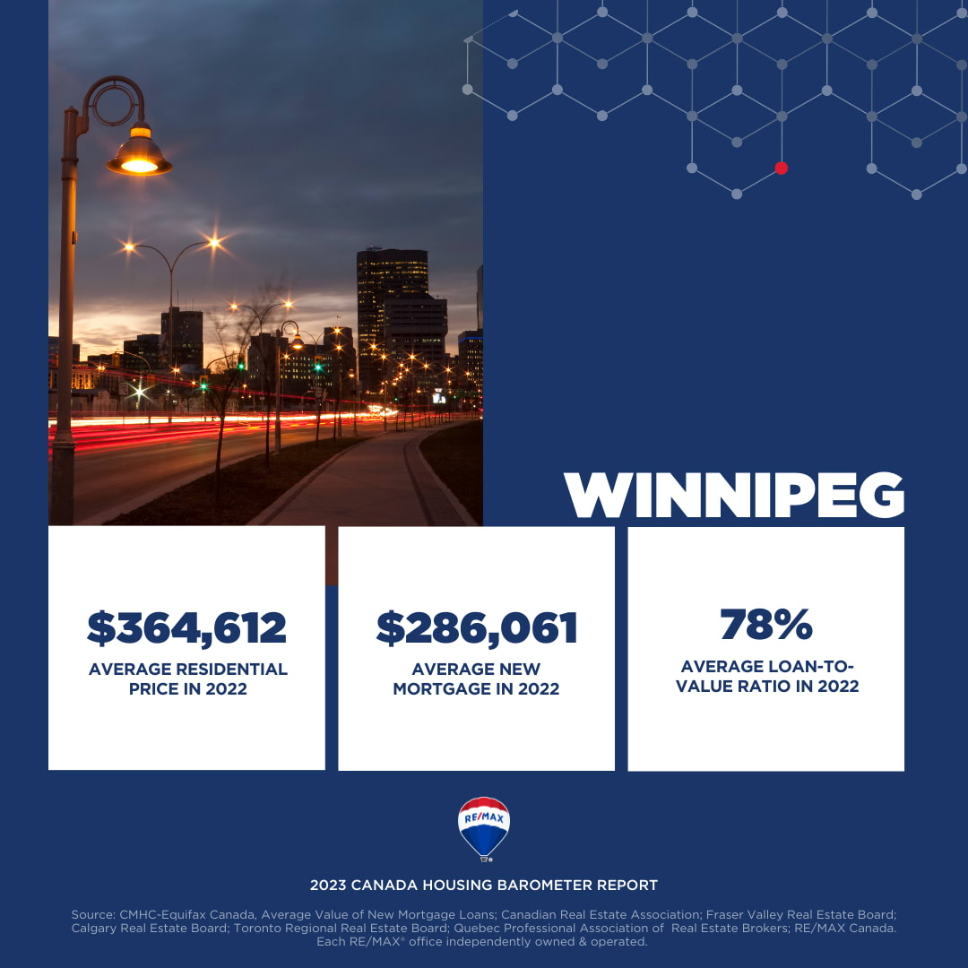 The RE/MAX 2023 Canada Housing Barometer Report examined average price and new mortgage values published by CMHC-Equifax Canada in 12 major markets from British Columbia to New Brunswick, to compare loan-to-value (LTV) ratios between Q3 2012 and Q3 2022. Share and access the full interactive report below.