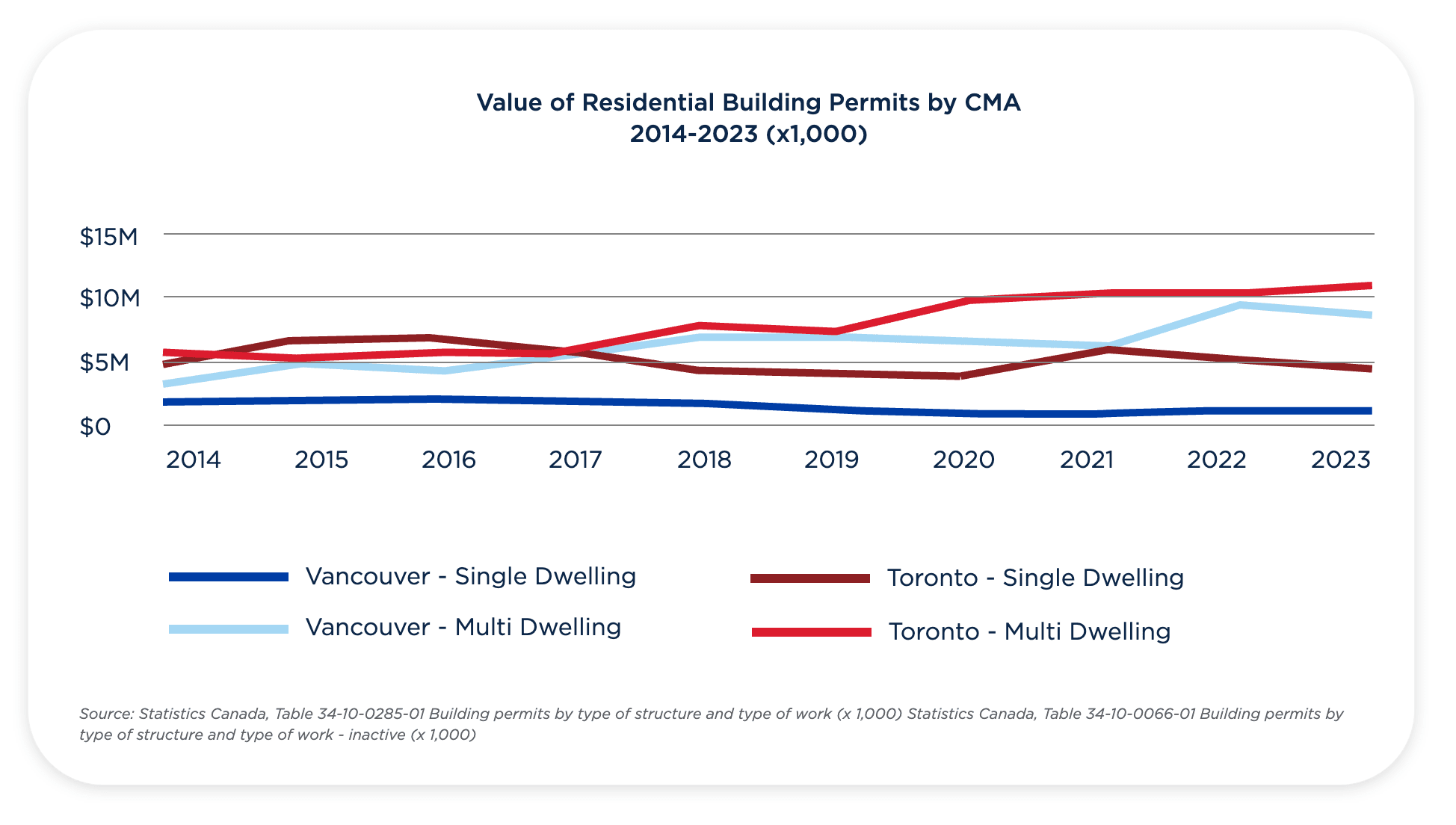 - Between 2019 and 2023, the increase in renovation spending approached $300 billion nationally, up 8% over the previous five-year period, yet the value of residential building permits issued for single-family dwellings fell in the Toronto and Vancouver during the same period, due to a greater focus on high-density construction.