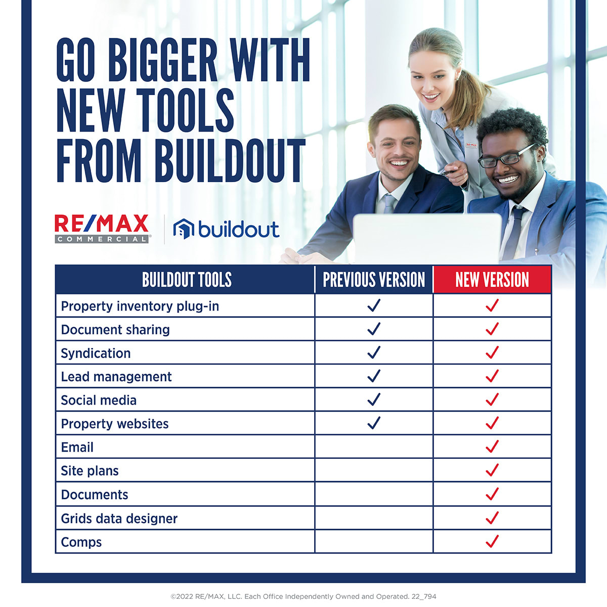 The enhanced offering provided by RE/MAX now offers RE/MAX Commercial Brokers the “Marketing” platform in addition to the “Listing” suite – all at no cost to the agent. The “Listing” suite of tools provides services such as property syndication, lead management, listing websites, document sharing and social media. The “Marketing” platform includes an email feature, site plans, comps, offering memorandums and agreements, and grids data designer.