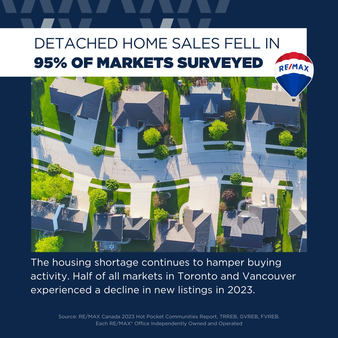 - Detached home sales fell in 95% of markets surveyed.
