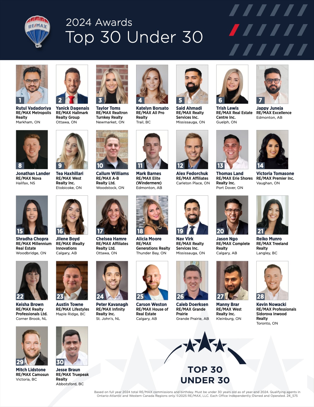 2024 RE/MAX Top 30 Under 30 March 5, 2025|Awards, Success Stories, News| Congratulations to all the 2024 RE/MAX Top 30 Under 30 award winners! We are proud of your outstanding achievements and for being a part of the RE/MAX Network. Access the Top 30 Under 30 Award Winner List